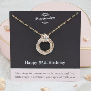 Celebrate her 55th birthday with one of our handmade silver and gold necklaces. The sentimental idea behind this gift is that the five larger rings represent five decades and the five smaller adjoining rings symbolise five years, taken together this unique combination of rings forms the basis of a wonderful keepsake to commemorate 55 years of a life well-lived.