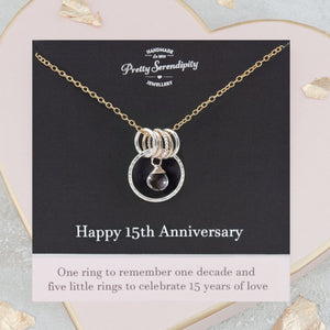 This silver and gold 15th wedding anniversary necklace features a gorgeous crystal briolette which sits inside a pendant made up from one large ring to represent one decade and five smaller adjoining rings to symbolise five years, taken together this unique combination of rings forms the basis of a wonderful keepsake to commemorate 15 years of marriage. The special meaning behind the pendant is highlighted on a complimentary gift card bearing the message 'One ring to remember one decade and five little rings to celebrate 15 years of love'. The rings that make up this pendant are handcrafted from 925 sterling silver and 14ct gold-fill wire.