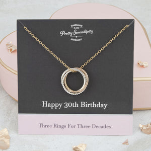 30th Birthday Necklace – 3 Rings for 3 Decades – Silver and Gold