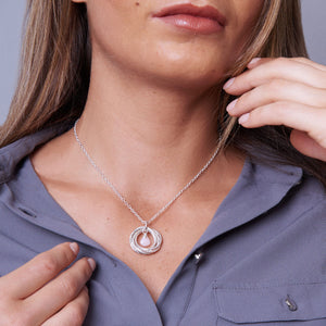 This 50th birthday necklace with birthstone would make an ideal gift for any woman who is just about to turn fifty. It features a pendant made up from five interlocking rings to represent each of the five decades the recipient is celebrating. The rings are all free-moving and measure approximately 19mm in diameter. The rings symbolise wholeness, strength, unity and everlasting love and they come in a combination of different textures including hammered, lined, beaded and plain.
