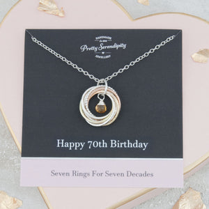 70th Birthday Birthstone Necklace – 7 Rings for 7 Decades – 9ct Gold and Silver