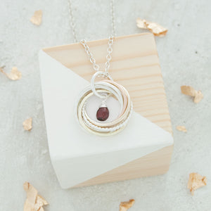 The pendant sits on a sterling silver chain and is made from a combination of two yellow gold, one rose gold and four sterling silver rings each measuring approximately 19mm in diameter. Sitting in the centre of the pendant is a gorgeous wire wrapped semi-precious birthstone. You are free to choose any applicable birthstone and all our stones are guaranteed to be of at least A grade quality. An all silver 70th birthday necklace with birthstone is also available in this range.