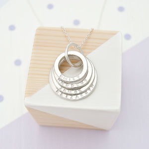 This personalised family name necklace features four free-moving sterling silver rings of various sizes. All four rings are handmade and have an organic look and feel due to the planishing technique that was used to create them. The rings/circles themselves represent unity, protection and eternal love and when personalised with the names of your children or grandchildren this necklace will allow you to 'figuratively' keep your family close to your heart wherever you go. As each ring is a different size it is common to put the oldest child on the large ring, the second oldest on the second largest and so on.