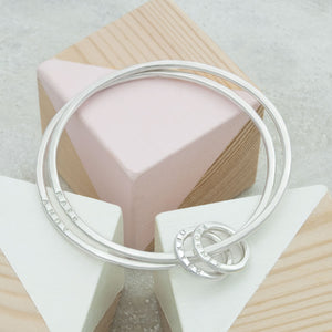 This beautiful 'My Family' bangle has room for the names of mum, dad and two children. When we personalise your jewellery we will stamp mum and dad's name on the two bangles and your children's names on the small interconnected rings that hang from the bracelet. Once completed you will have a unique piece of jewellery that will allow you to 'figuratively' keep your family close to you at all times.