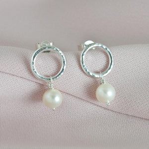 Handcrafted from 925 sterling silver the earrings feature a design based around circles and pearls. The circles, or halo's as we like to call them, have been gently hammered to create a unique textured appearance which not only gives them a wonderful tactile feel, but it also allows them to sparkle and shine when they catch the light. Hanging down from each halo is a gorgeous wire wrapped pearl which adds a touch of opulence to these fabulous creations.