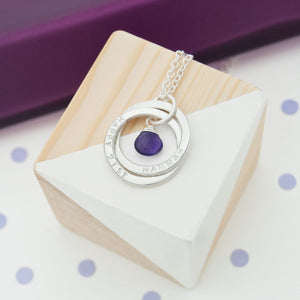 This personalised 21st birthday necklace with birthstone would make an ideal gift for any daughter, sister or friend who is just about to turn twenty one. The necklace features a pendant made up from two interlinked and free-moving sterling silver rings and a gorgeous wire wrapped birthstone charm of your choosing. The rings can be personalised with the birthday girl's name and a special birthday message or you can leave one or both of the rings blank - the choice is yours! The special meaning behind the pendant is highlighted on a gift card bearing the message 'Two rings to remember each decade and a birthstone to celebrate your special 21st year!'. The rings/circles themselves represent strength, unity, protection and everlasting love.