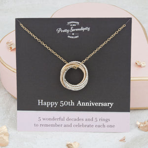 This silver and gold necklace would make an ideal 50th anniversary gift. Handcrafted from 925 sterling silver and 14ct Gold-fill wire it features a pendant made up from five free-moving rings to represent each of the five decades you have been together as husband and wife. The rings are all slightly different to emphasise the fact that each one represents a different decade of your marriage and when joined together they symbolise wholeness, strength, unity and everlasting love. The special meaning behind the pendant is highlighted on a complimentary gift card bearing the message '5 wonderful decades and 5 rings to remember and celebrate each one'.