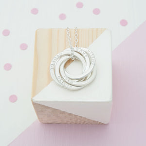 This personalised five ring russian necklace features a pendant made up from five interlinked and free-moving sterling silver rings. Because of the way the circles are entwined a russian ring is traditionally worn as a symbol of strength, unity and everlasting love, making them the ideal choice if you're looking for a necklace that can be personalised with the names of your loved ones.