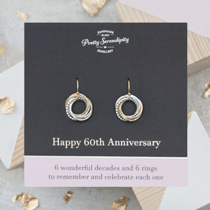 These silver and gold earrings would make an ideal 60th anniversary gift. Handcrafted from 925 sterling silver and 14ct Gold-fill wire each earring features a charm made up from six free-moving rings to represent each of the six decades you have been together as husband and wife. The rings are all slightly different to emphasise the fact that each one represents a different decade of your marriage and when joined together they symbolise wholeness, strength, unity and everlasting love. The special meaning behind the earrings is highlighted on a complimentary gift card bearing the message '6 wonderful decades and 6 rings to remember and celebrate each one'.